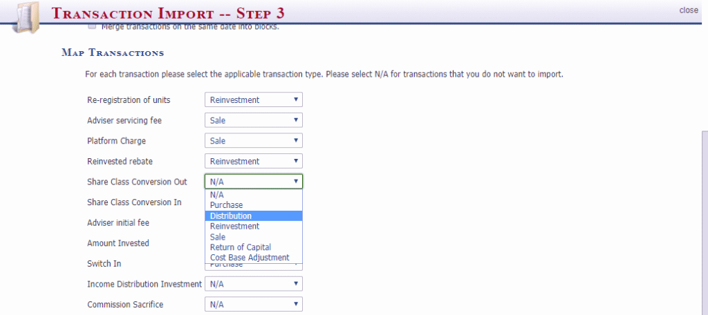 Select N/A if any of the transaction types does not apply to this fund and it will be skipped at import.