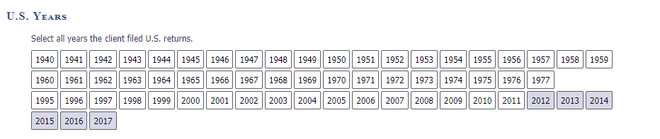 Select all years the client has filed a US return.