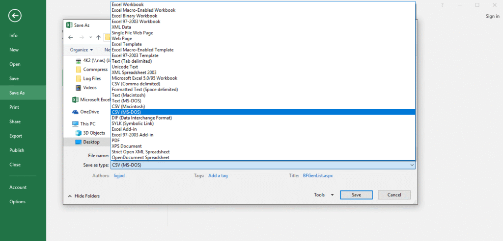 Select the folder where you would like to save the file and change the file type to CSV (MS-DOS).