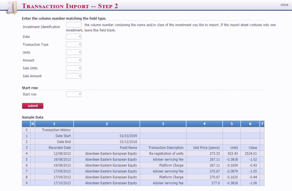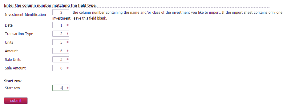 In order to import, you first must map the columns in your document to specify which columns contain the Date, Transaction Type, Units, Amounts and the start row.