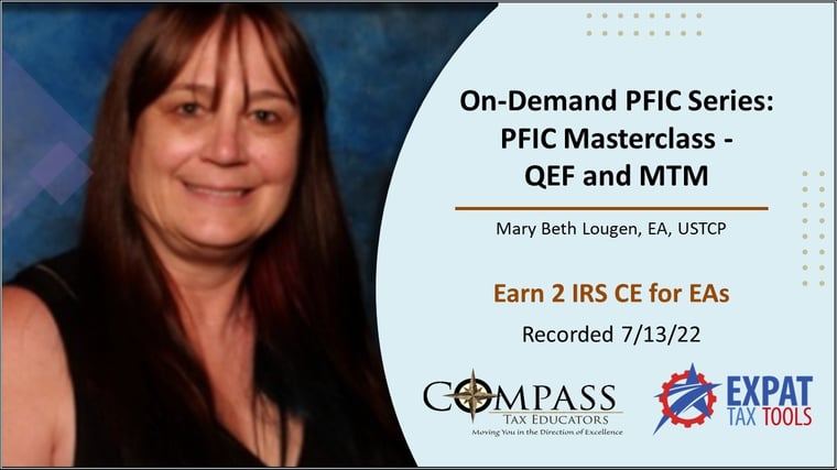 This course, aimed at practitioners with an intermediate level of understanding of PFIC taxation, includes comprehensive computations needed to complete Form 8621 under the §1296 mark to market and §1295 qualified electing fund regimes.